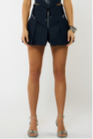 The scort is made of raw denim in midnight blue. It features an exposed front metal zip, two welt pockets at the back. The pleats have concealed satin panels.